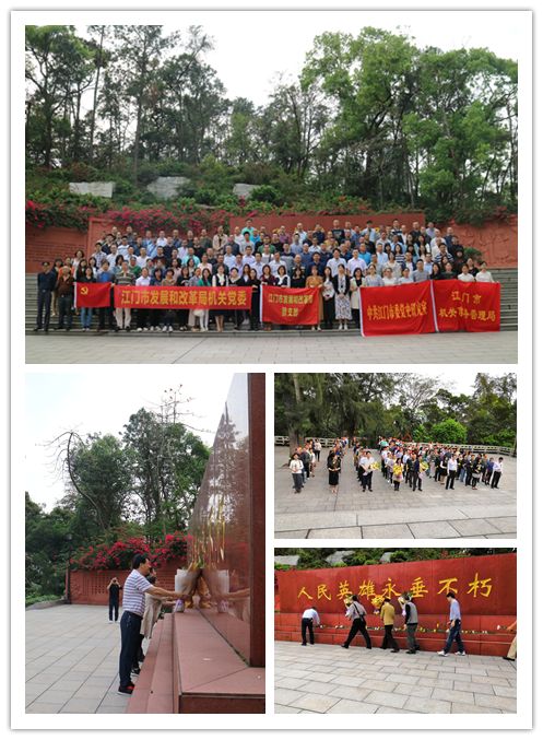 全体人员来到革命烈士碑前默哀,每人手持菊花心怀敬意地走向碑前献花,以表达对革命先烈永远的怀念和无限的敬仰;随后大家认真聆听市委党史研究室的同志讲解江门籍烈士英雄事迹,全体党员在庄重肃穆的气氛下重温了入党誓词。