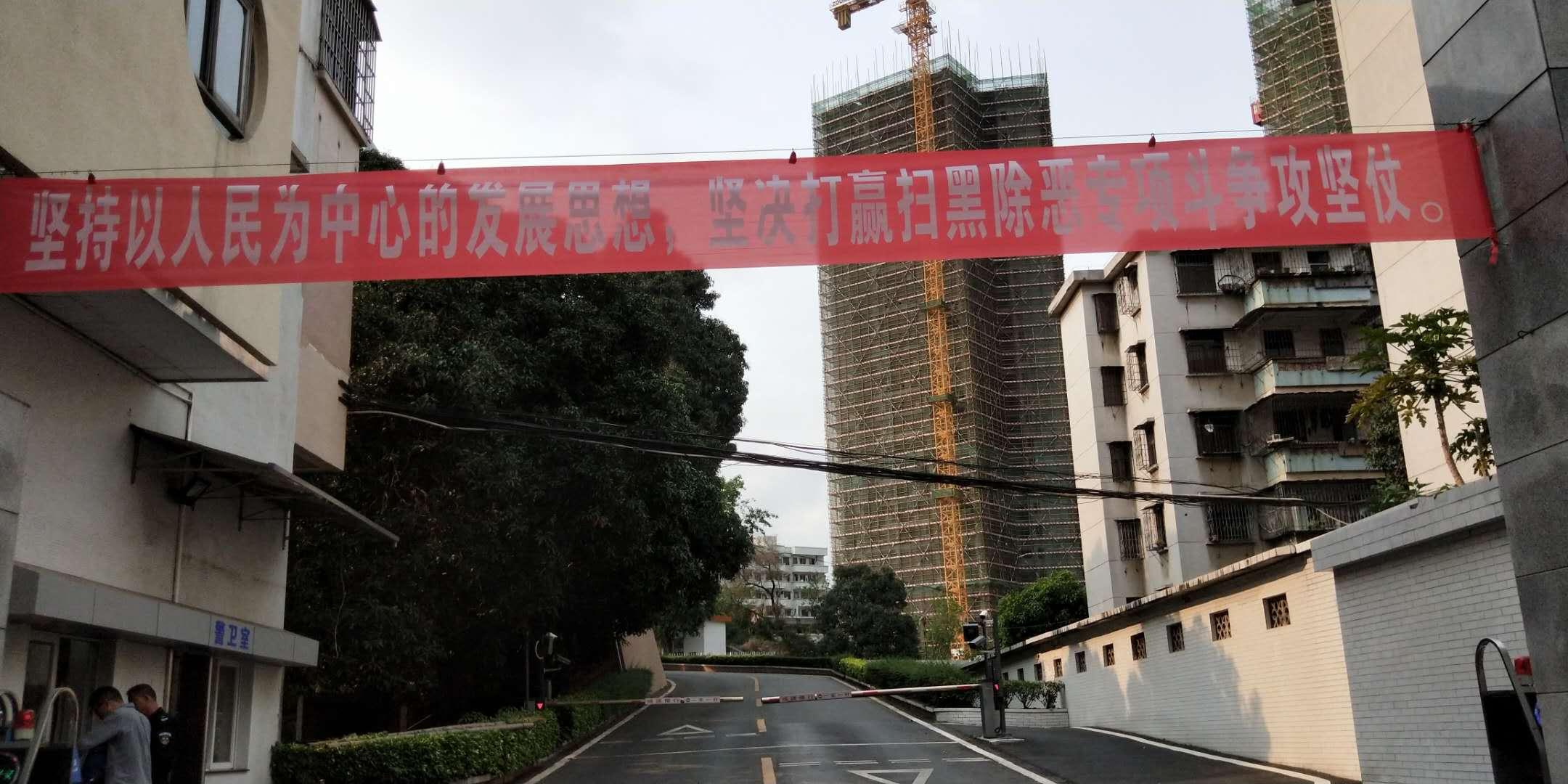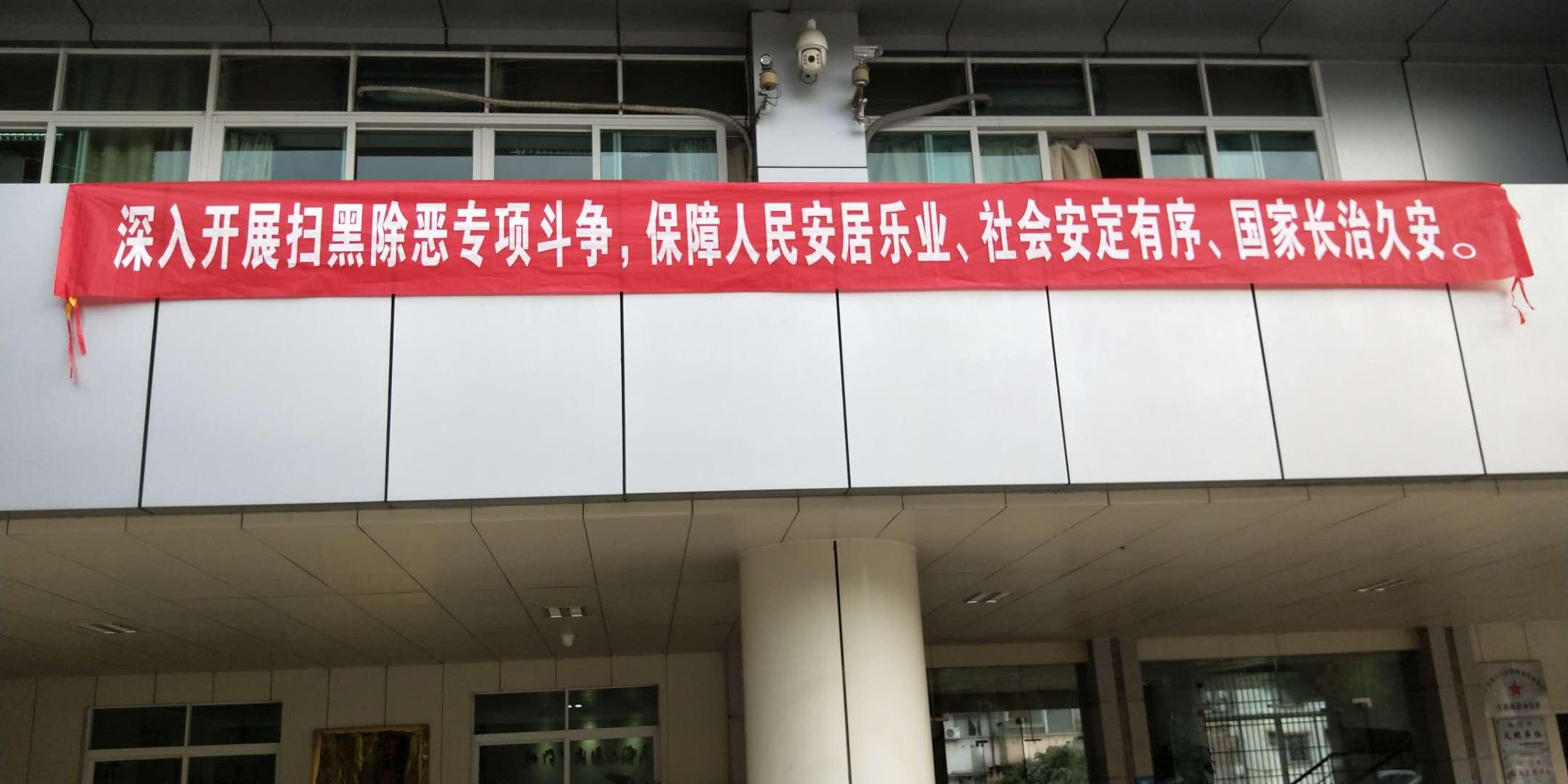 4.办公大楼上方悬挂的“深入开展扫黑除恶专项斗争,保障人民安居乐业、社会安定有序、国家长治久安”标语横幅。