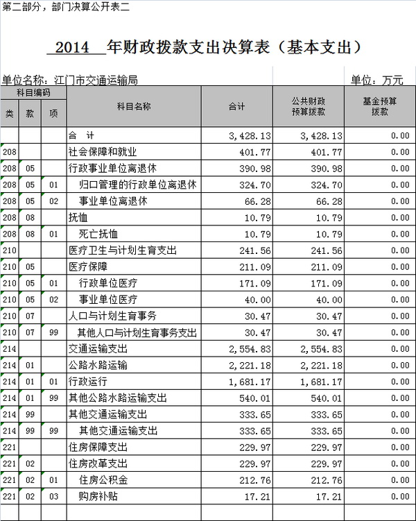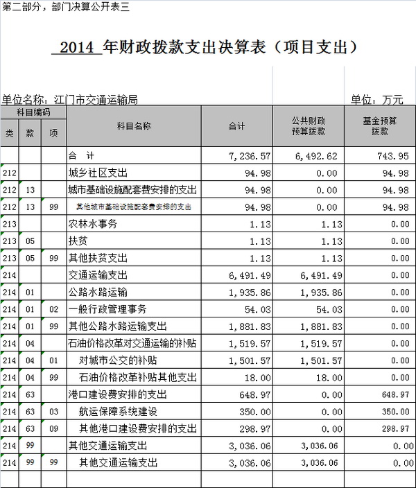 2.交通运输(类)公路水路运输(款)决算支出1,935.86万元,主要支出项目:交通基础设施建设、规划前期费用支出,交通运输管理业务专项支出,交通综合行政执法专项支出,交通工程质量监督、检测专项支出,江门港引航专项支出,货物码头管理专项支出,返还企业政策性补贴支出、对企事业单位单位补助等。支出比上年同期减少2,110.24万元,减少原因主要是会计制度改革后资金性质分类改变,如按同一资金性质分类,支出与上年度对比基本持平。