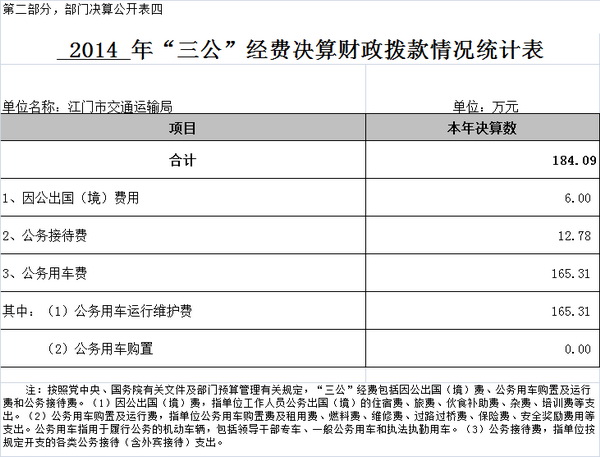 2014 年SG飞艇(中国)开奖记录查询站交通运输局(含下属单位)用财政拨款开支的出国(境)经费、车辆购置及运行费、公务接待费(简称“三公”经费)支出合计184.09万元。