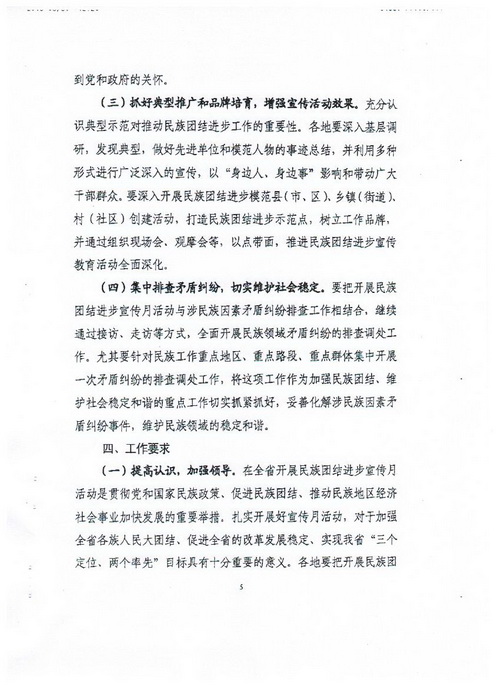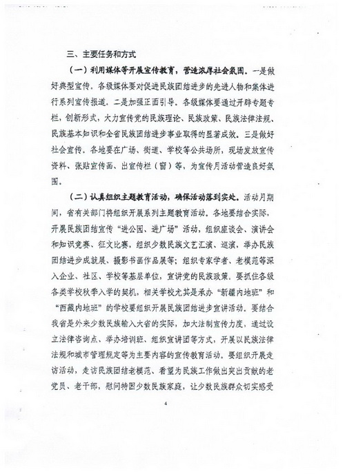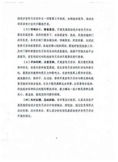 少数民族风采。五、各级工会、共青团、妇联等人民团体,要积极开展丰富多彩的宣传活动,增强各级干部群众的民族政策法制观念以及自觉维护民族团结和社会稳定的意识。