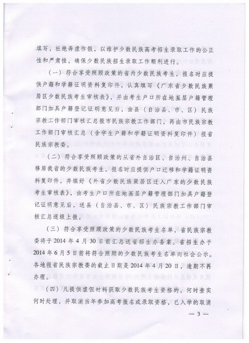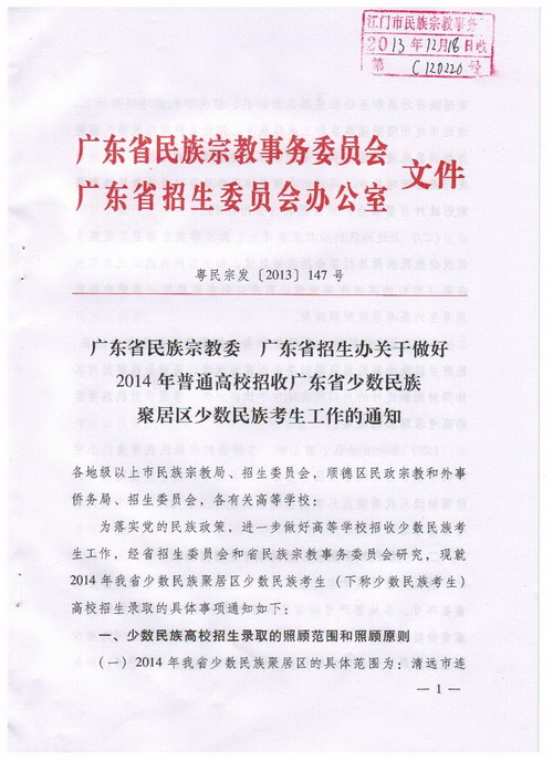现将广东省民族宗教事务委员会和广东省高等中专学校招生委《关于做好2014年普通高校招收广东省少数民族聚居区少数民族考生工作的通知》(粤民宗发[2013]147号)转发给你们,请按照要求,认真做好普通高等学校招收少数民族考生工作。