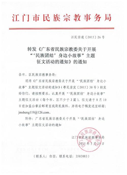 现将《广东省民族宗教委关于开展“‘民族团结’身边小故事”主题征文活动的通知》(粤民宗发〔2015〕30号)转发给你们,请按照要求,认真开展“‘民族团结’身边小故事”主题征文活动(每个市、区不少于2篇)。征文请于8月10日前加盖公章后邮寄至我局民族科,并将电子稿发送至邮箱:[email protected]。