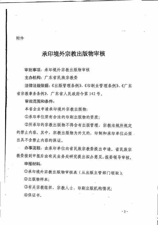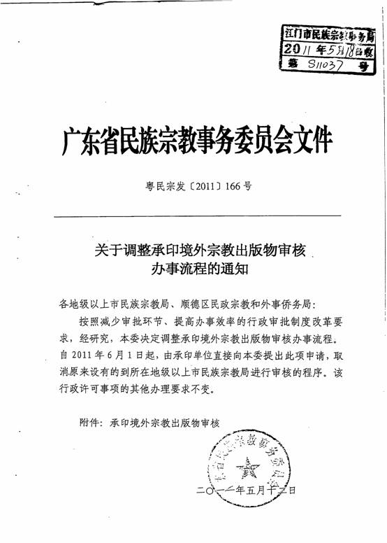 附件:广东省民族宗教委员会《关于调整承印境外宗教出版物审核办事流程的通知》(粤民宗发[2011]166号)