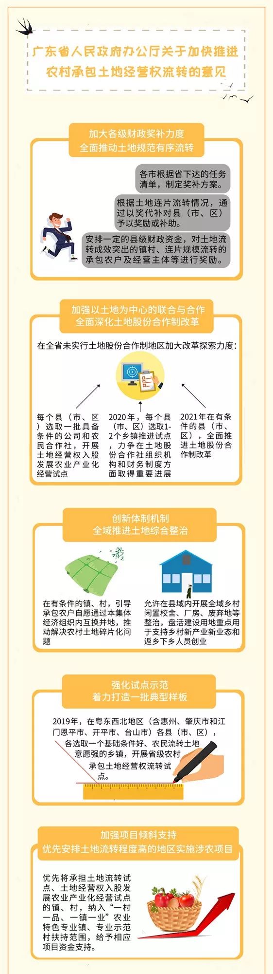 为深入实施乡村振兴战略,不断巩固完善农村基本经营制度,深化农村土地制度改革,解决广东省农村承包地细碎化问题,发展多种形式的农业适度规模经营,支持现代农业、特色农业发展,促进农民增收,推动乡村全面振兴,经省人民政府同意,就加快推进农村承包土地经营权流转提出了十条意见。