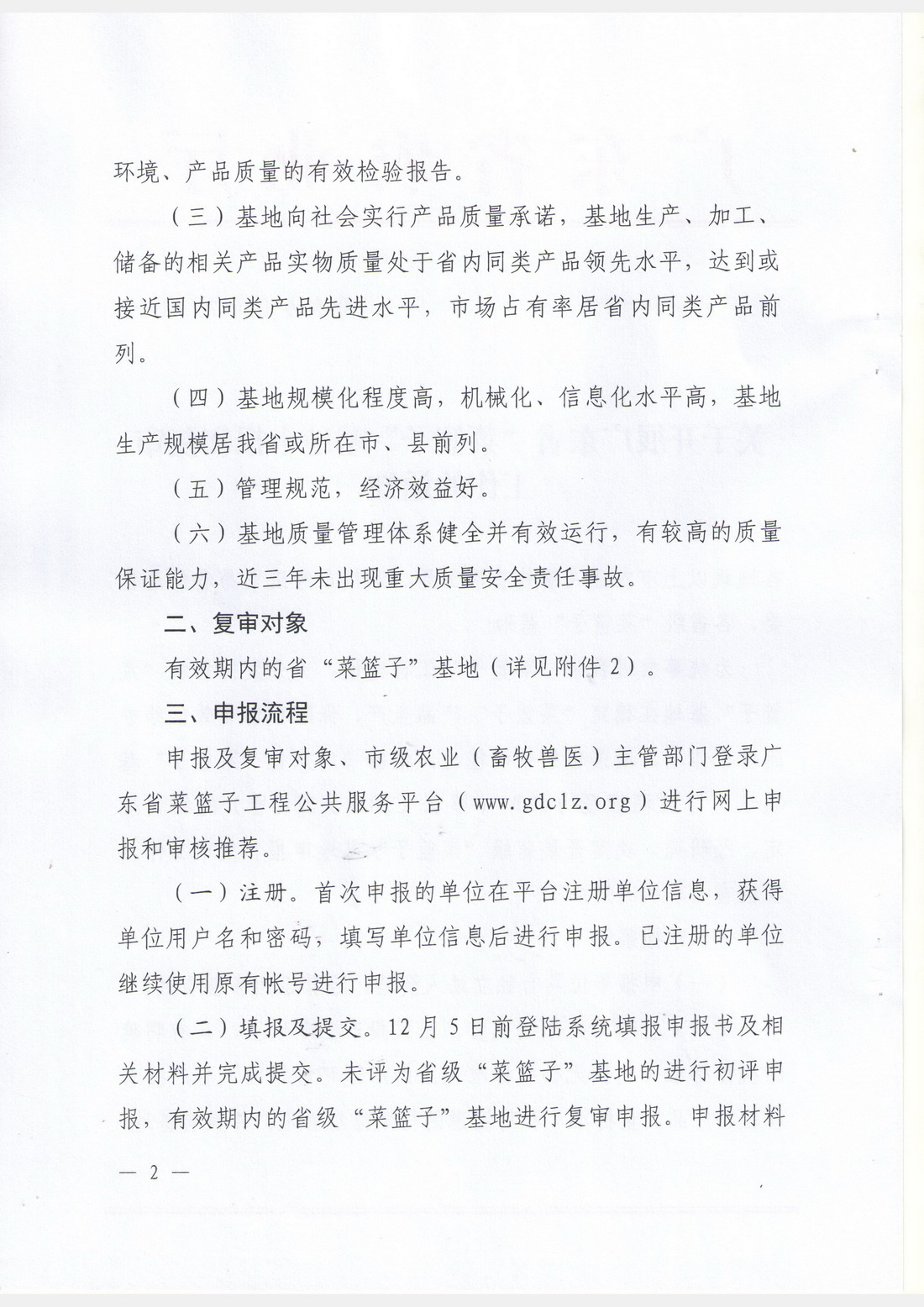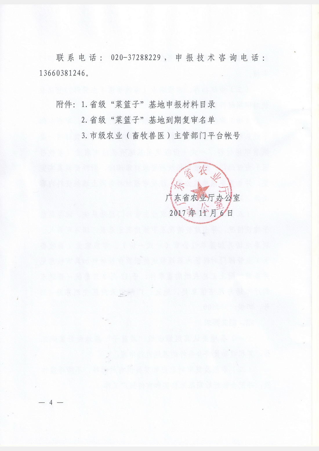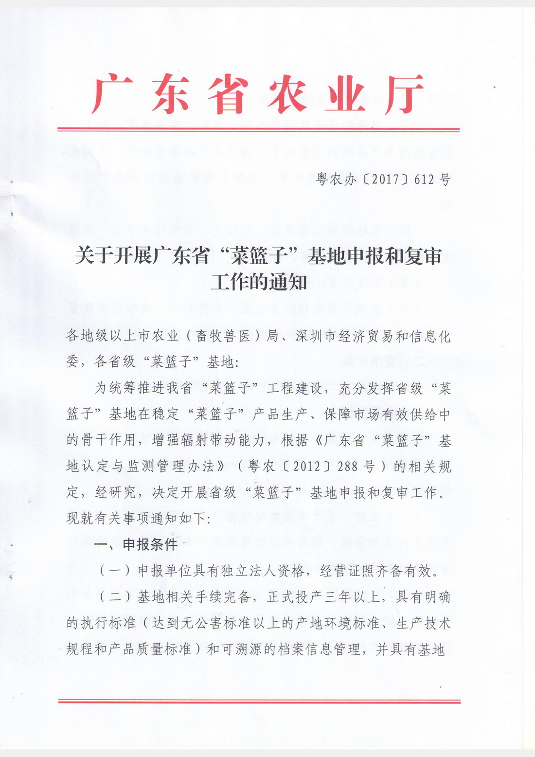 现将广东省农业厅《关于开展广东省“菜篮子”基地申报和复审工作的通知》(粤农办[2017]612号)转发给你们,具体事项通知如下: