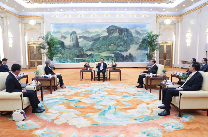 国务院总理李克强8月22日上午在人民大会堂会见来华出席中日韩外长会的韩国外长康京和、日本外相河野太郎。