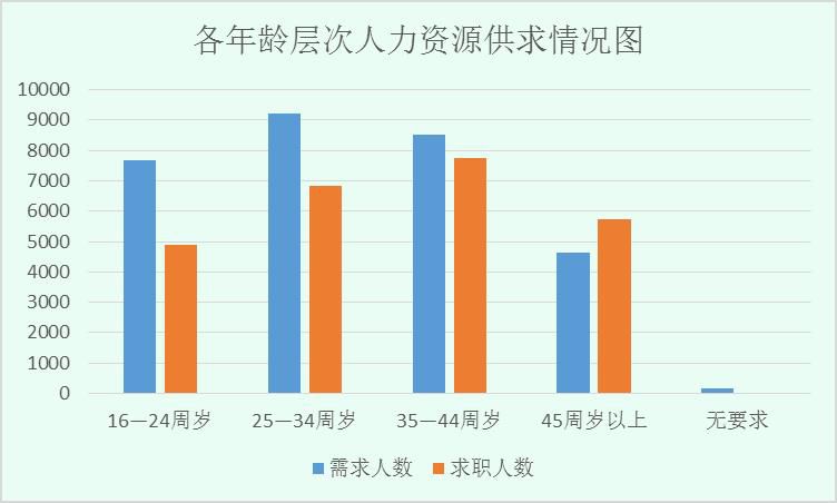 第四季度,对求职者年龄无要求的招聘职位数仅占本季度招聘职位数总量的0.57%。根据《就业促进法》的有关规定,不允许对年龄、性别等有歧视,但是,在实际操作中,企业仍然对劳动者的年龄有一定的要求。数据显示,企业为各年龄阶层提供的工资收入水平差距不大,对各年龄阶层招聘的人数也较为均匀。招聘人数方面,25-34周岁的劳动者最多,占了全市总需求的30.47%;求职人数方面,35-44周岁的求职者最多,占全市总需求的30.79%。除了45周岁以上的劳动力供过于求外,其他年龄段的职位都是供不应求的。45周岁以上的劳动者就业竞争压力最大,而16—24周岁的年轻劳动力是市场最缺少的,职位供求比为1:0.64。