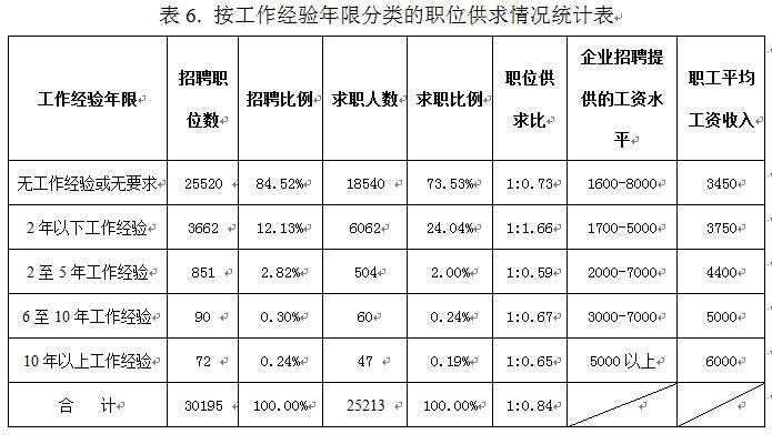 用人单位招工对工作经验的要求不高,超8成招聘职位没有经验要求,体现了企业在用工需求方面更具包容性,也更愿意通过自身的培养来提高劳动者的技能,既能缓解用工的压力,从整体上也更有利于提高整体劳动者的就业能力。数据显示,除了对2年工作经验以下的职位供过于求外,其余职位都供不应求。从薪酬待遇的角度看,职工的工资收入水平与其工作经验年限多少呈正相关的关系。