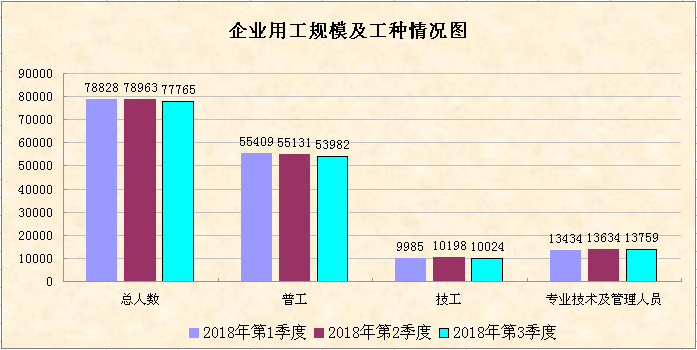 企业第三季度的在岗员工数量为77765人,比上季度减少了1198人,降幅为1.52%。其中,普工53982人,占69.42%,环比减少2.08%;技工10024人,占12.89%,环比减少1.71%;专业技术及管理人员13759人,占17.69%,环比增加0.92%。