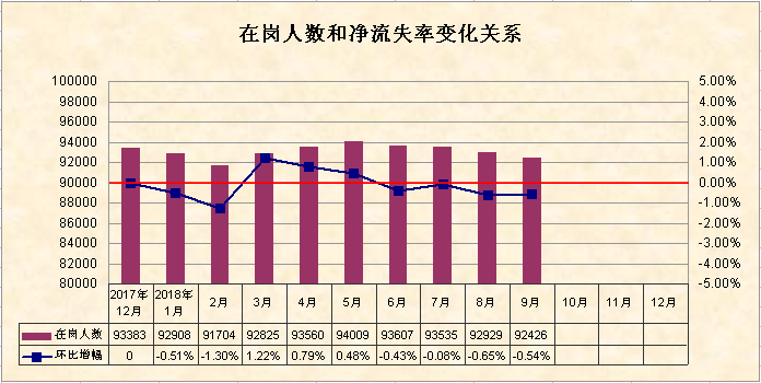 9月末全市监测企业岗位总人数有92426人,比上期企业岗位减少503人,环比减少0.54%。从表11的图表分析数据来看:企业在岗人数由2017年12月底建档期的93383人,减少到2月份春节期间最低的91704人,节后3-5月期间在岗人数逐月回升到最高的94009人,6-9月期间,在岗人数开始呈现每月逐步小幅下降,截至9月底减少至92426人,与第二季度末相比减少1181人,反映企业用工高峰在逐步回落。