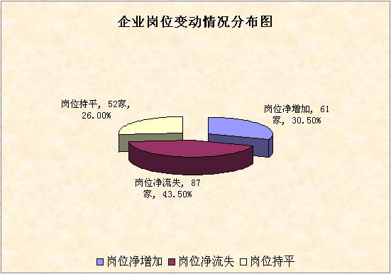 9月末全市监测企业发生岗位数量环比净增加的有61家,占30.5%,共增加岗位455个,环比增加1.49%;岗位数量环比净流失的有87家,占43.5%,共减少岗位958个,环比减少1.85%;岗位数量保持不变的有52家,占26%。