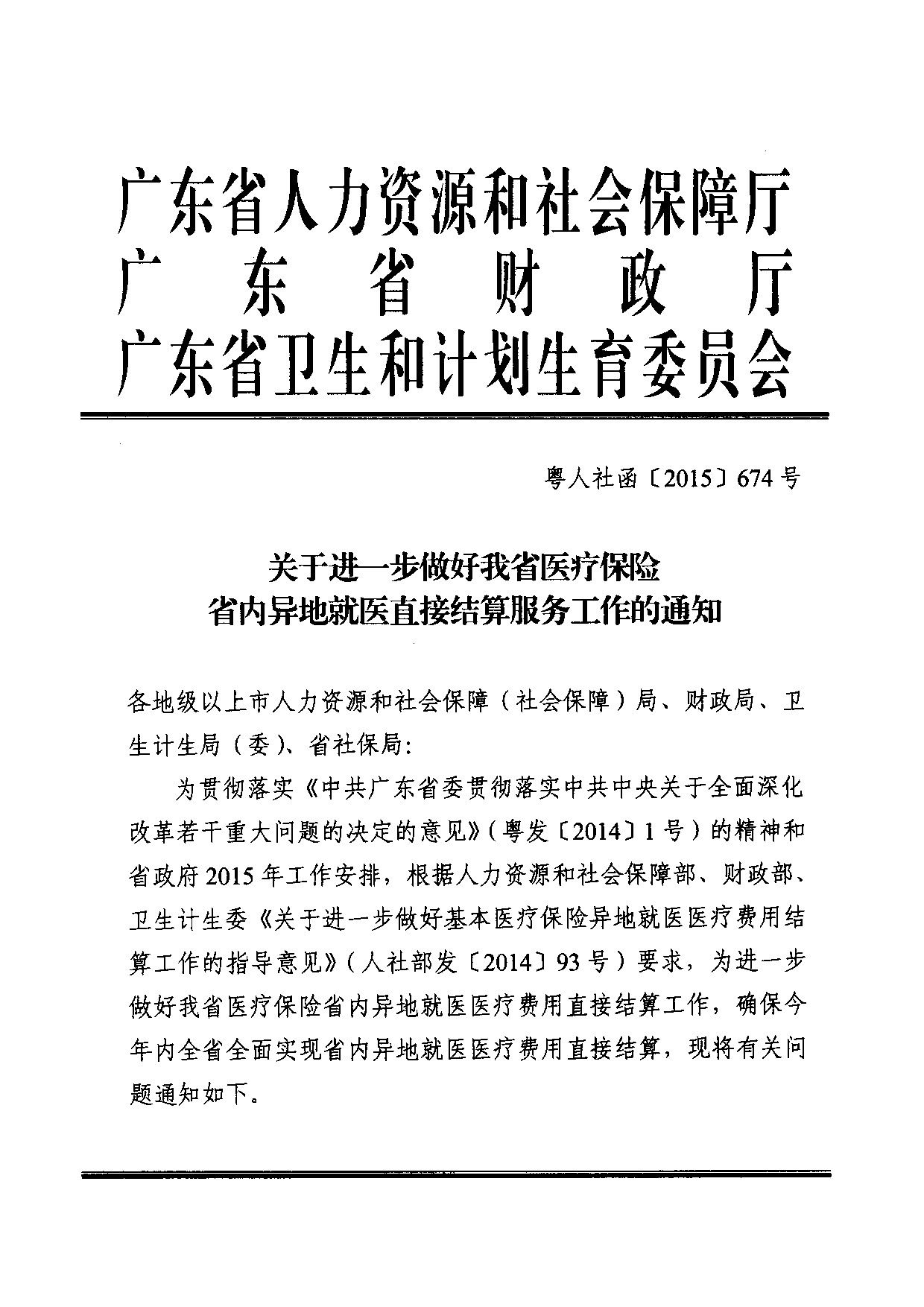现将省人社厅、财政厅、卫生计生委《关于进一步做好我省医疗保险省内异地就医直接结算服务工作的通知》(粤人社函〔2015〕674号)转发给你们,请遵照执行。
