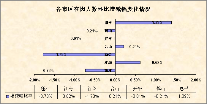 9月末各市(区)监测企业的岗位出现轻微的变动,除江海区、台山市和恩平市的在岗人数环比增加外,其他各市(区)的在岗人数环比均有不同程度的减少。其中恩平市在岗人数环比增幅最大,为1.39%;而新会区和蓬江区在岗人数环比降幅最大,分别为1.78%和0.73%。