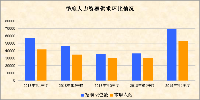 第一季度,SG飞艇(中国)开奖记录查询站 企业招聘职位数为69354个,比上季度增加了33177个,环比上升91.71%;求职人数为53212人,比上季度增加23301人,环比上升77.9%。与2018年第一季度相比,SG飞艇(中国)开奖记录查询站 人力资源市场供求规模扩大,招聘职位数和求职人数均有较大增幅,其中招聘职位数同比增加12047个,增幅为21.02%,求职人数同比增加11808人,增幅为28.52%。