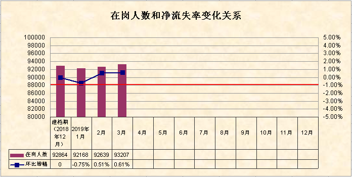 截至2019年第一季度末,全市450家用工定点监测企业实有在岗人数比上年第四季度有所增加,增幅为0.79%;第一季度新招人数比上季度增加2985人,增幅为68.97%,反映企业第一季度的用工需求有所扩大;第一季度流失人数多于新招人数,净流失1196人,比上季度增加851人,用工稳定性较上季度差。截至3月底,全市200家失业动态监测企业实有在岗总人数93207人,比上年12月建档期增加343人,反映企业节后经过员工返岗和新增招聘,用工总量得到有效补充。
