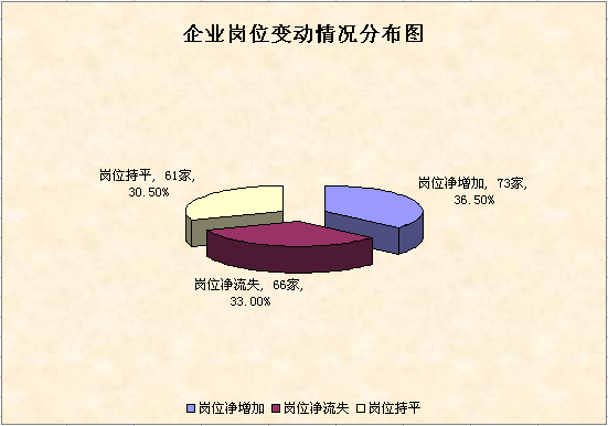 3月末全市监测企业发生岗位数量净增加的有73家,占36.5%,共增加岗位1765个,环比增加4.59%;岗位数量净流失的有66家,占33%,共减少岗位644个,环比减少1.67%;岗位数量保持不变的有61家,占30.5%。