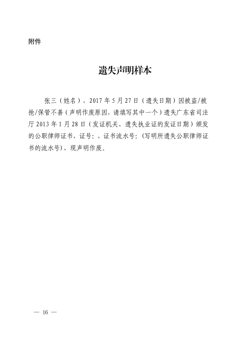 (二)公职律师证书破损的提交破损的公职律师证书,公职律师证书遗失的提交遗失证明(内容和格式见附件);