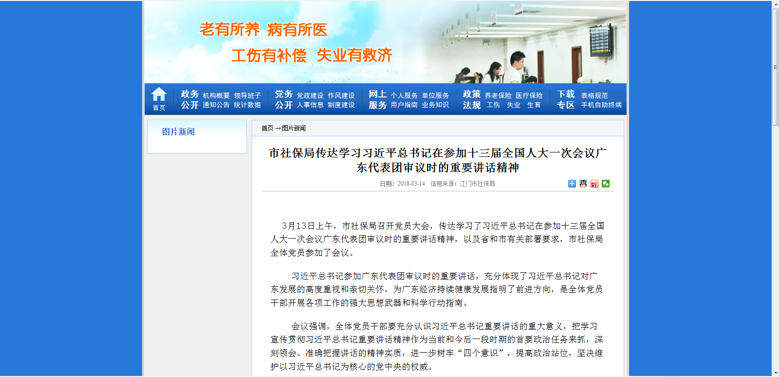 二、抓宣传。为了营造良好的舆论氛围,我局多渠道开展社会宣传活动。一是通过LED屏循环播放宣传标语,二是以局门户网站、政务之窗、红星网发布宣传文稿等方式宣传习近平总书记的重要讲话精神,三是及时在江门社保微信公众号、微博撰写或转载学习习近平总书记重要讲话精神的系列宣传文稿。截至目前,我局通过门户网站、微信、微博等渠道共发布相关宣传信息8条。