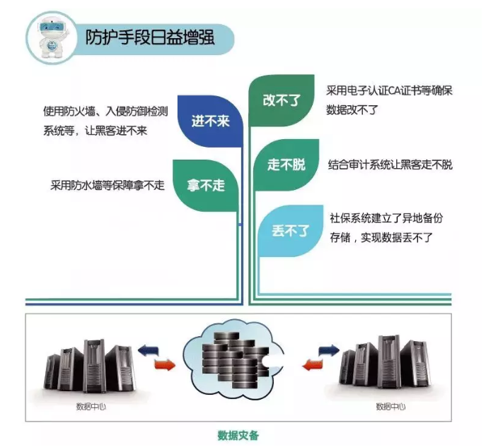 ◇ 丢不了:社保系统建立了异地备份存储,实现数据丢不了。