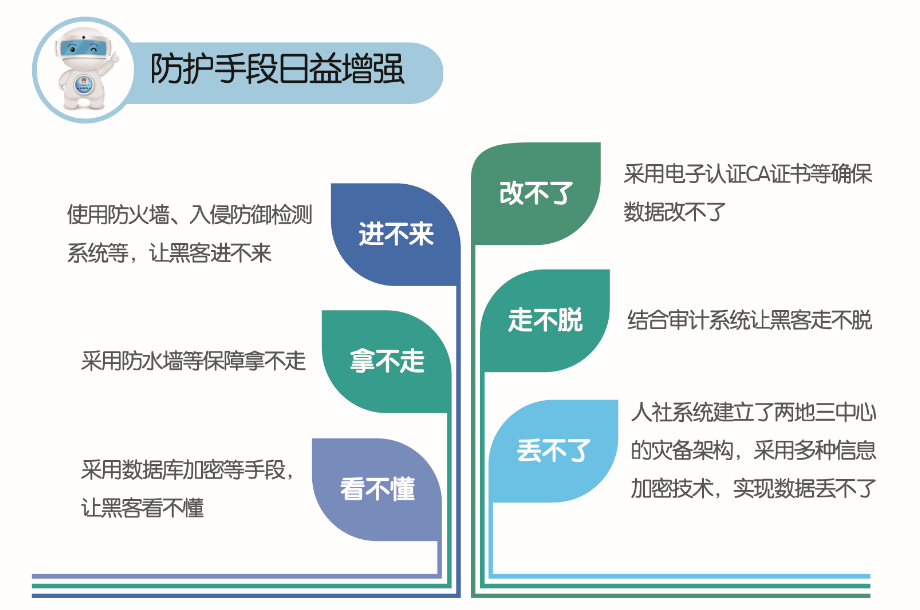 丢不了:人社系统建立了灾备架构,采用多种信息加密技术,实现数据丢不了。