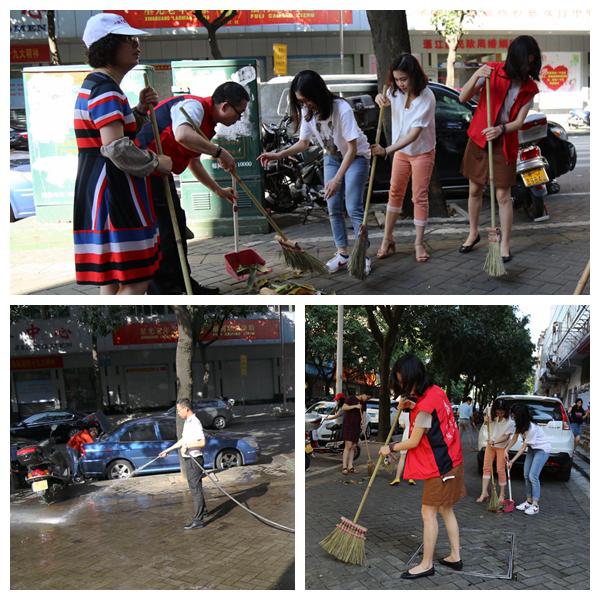 党员义工和青年志愿者兵分两路,一队负责单位办公楼外墙清洗,拆除影响市容市貌的广告、条幅和宣传标语,打扫、冲洗办公楼前街道,营造干净整洁的城市容貌。