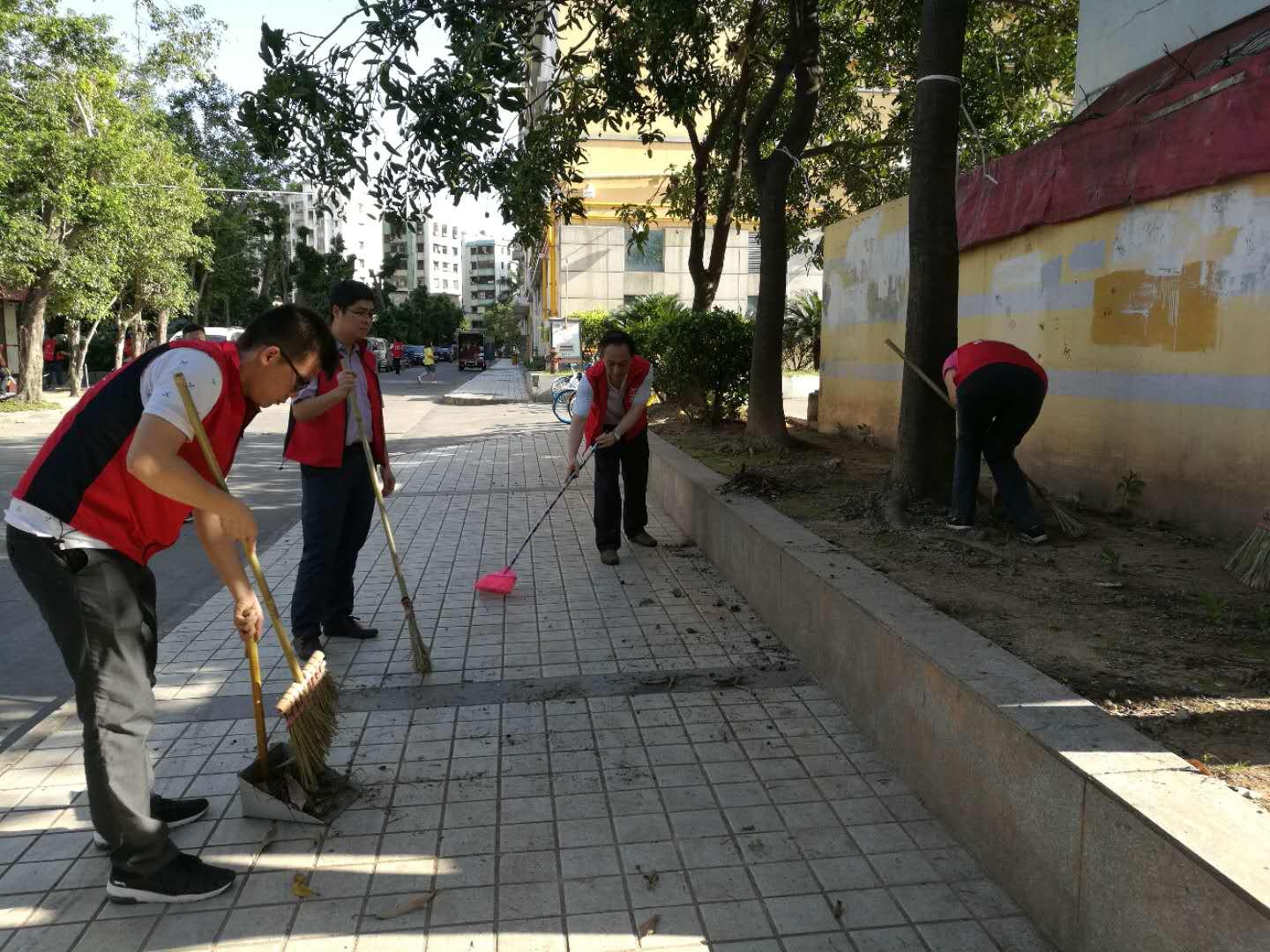 另一队与蓬江区丰乐社区义工一起,以社区篮球场为中心,清理篮球场周边环境卫生,修剪杂草,清扫背街小巷及人行道,打造洁美温馨的社区环境。