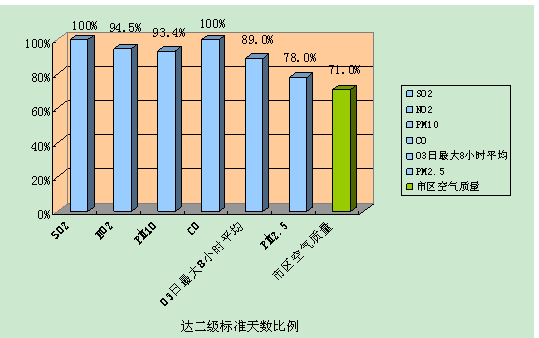 2013年市区二氧化硫(SO2)年均浓度值为27微克/立方米,达国家二级标准天数比例为100%;二氧化氮(NO2)年均浓度值为33微克/立方米,达国家二级标准天数比例为94.5%;可吸入颗粒物(PM10)年均浓度值为76微克/立方米,达国家二级标准天数比例为93.4%;一氧化碳(CO)达国家二级标准天数比例为100%;臭氧(O3)达国家二级标准天数比例为89.0%;细颗粒物(PM2.5)年均浓度值为50微克/立方米,达国家二级标准天数比例为78.0%。