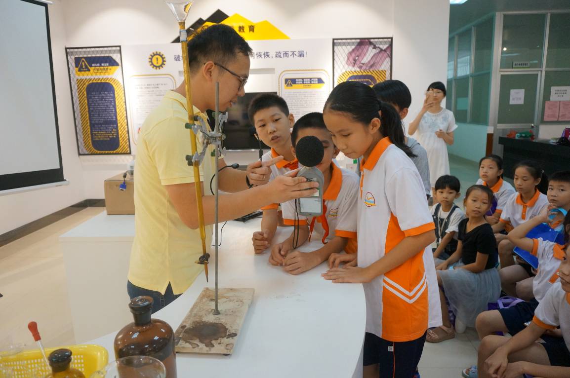 随后由鹤山市环境保护监测站的工作人员现场为师生家长们演示环保小实验,包括:噪声测定、自来水中氯化物测定、pH试纸测定酸碱度、水中电导率测定等。现场工作人员还邀请了个别学生及家长一起加入到小实验之中,动静结合,通过现场观察记录反应的全过程,让学生们留下更为深刻的印象,开拓了视野。