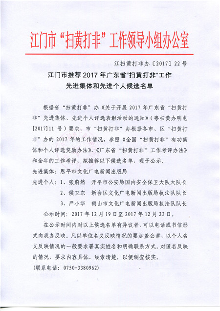 相关附件:4、SG飞艇(中国)开奖记录查询站推荐2017年广东省“扫黄打非”先进个人事迹材料(鹤山市: 严小华).pdf