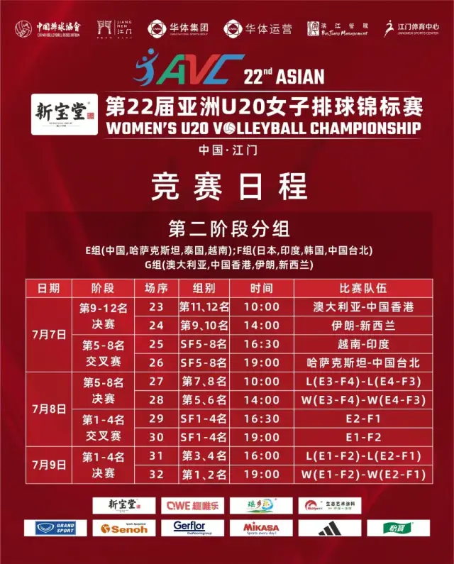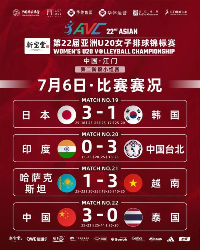 7月6日,第22届亚洲U20女子排球锦标赛在广东江门体育中心体育馆结束八强复赛的争夺。中国队3比0战胜泰国队,三局比分为25比23、25比11、25比20。中国队以全胜战绩获得E组第一名晋级四强,半决赛将对阵F组第二名韩国队。