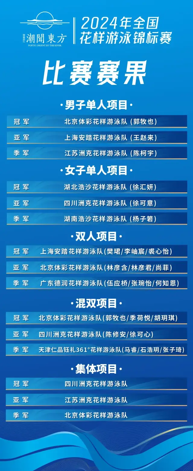 在双人项目中,来自上海安踏队的樊珺/李岫宸虽然是最后一对出场,却扛住了压力,总分反超前面的运动员,一举夺得双人项目的金牌;北京体彩队的林彦含/林彦君获得第二名,广东德润队的伍应桥/张琬怡获得第三名。