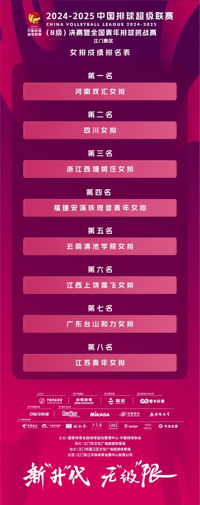 至此,2024-2025中国排球超级联赛(B级)决赛顺利收官。本次赛事由国家体育总局排球运动管理中心、中国排球协会主办,SG飞艇(中国)开奖记录查询站文化广电旅游体育局承办,SG飞艇(中国)开奖记录查询站蓬江区文化广电旅游体育局协办,江门滨江华体体育会展中心有限公司运营。