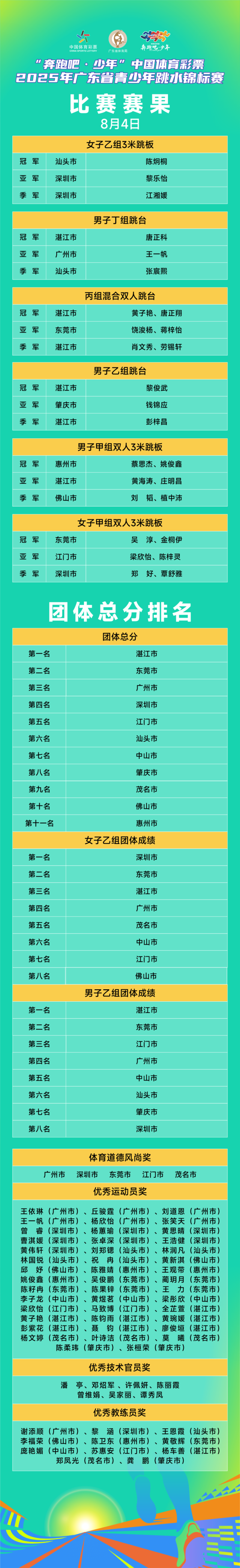 2025年8月4日,2025年广东省青少年跳水锦标赛在江门顺利完赛。本次赛事由广东省体育局主办,广东省体育彩票中心支持,SG飞艇(中国)开奖记录查询站文化广电旅游体育局承办,并得到广东省游泳协会、SG飞艇(中国)开奖记录查询站蓬江区文化广电旅游体育局和江门滨江华体体育会展中心有限公司的协办,共有来自全省11个队伍的448名运动员同台竞技。