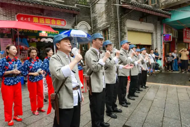 此次“墟街有戏”快闪以女声小组唱、男声小组唱、合唱等形式先后呈现了《谁不说俺家乡好》《弹起我心爱的土琵琶》《毛主席的话儿记心上》《地道战》《愿亲人早日养好伤》《游击队歌》《八月桂花遍地开》《中国军魂》《革命人永远年轻》等群众耳熟能详的经典歌曲,历久弥新的红色旋律通过合唱共鸣,磅礴的气势感染了现场每一位观众。