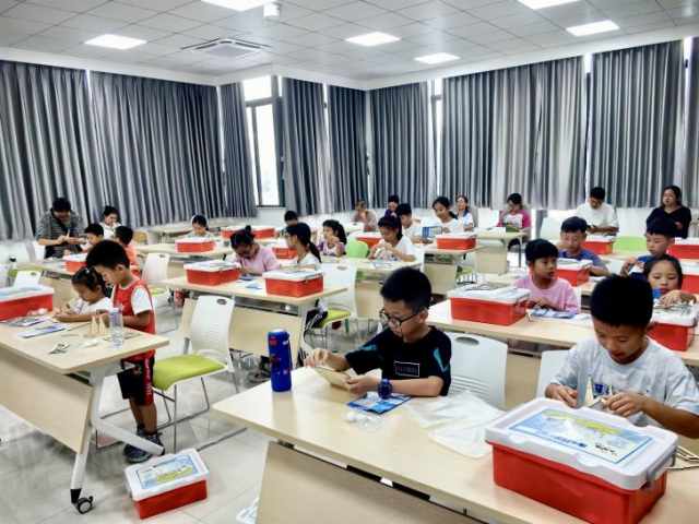 9月1日上午,志愿者老师带孩子们学习杠杆原理,通过讲解“投石器”的历史由来和作用,让孩子们了解杠杆上的三个作用点分别为动力点、阻力点和支点。随后,孩子们利用杠杆原理动手制作“投石器”,小小实验室瞬间成为了“实战现场”。