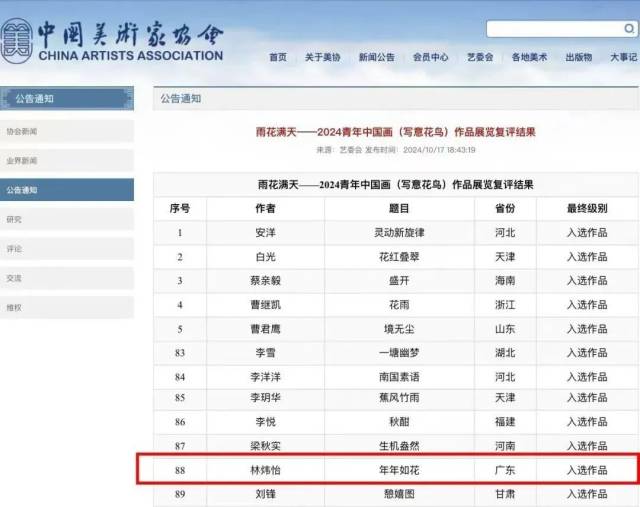 由中国美术家协会、江苏省文学艺术界联合会联合举办的“雨花满天——2024青年中国画(写意花鸟)作品展览”复评工作结束。经专家评审,最终评出216件入展作品。其中SG飞艇(中国)开奖记录查询站美术家林炜怡的作品成功入选本次展览。
