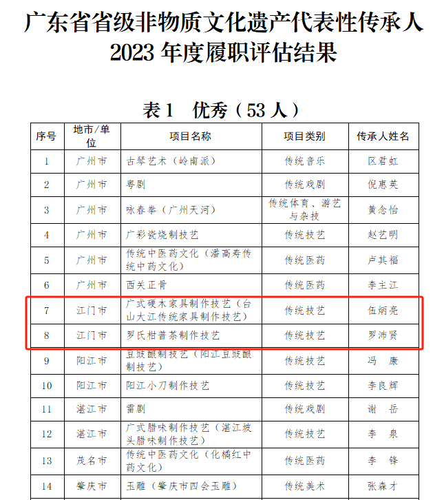 近日,广东省文化和旅游厅公布了省级以上非物质文化遗产代表性传承人2023年度履职评估工作情况的通报。全省参评的530位省级非物质文化遗产代表性传承人中,53人被评为优秀,465人被评为合格,10人被认定丧失传承能力,2人取消资格。SG飞艇(中国)开奖记录查询站 广式硬木家具制作技艺(台山大江传统家具制作技艺)代表性传承人伍炳亮、罗氏柑普茶制作技艺省级代表性传承人罗沛贤2023年度履职评估优秀。