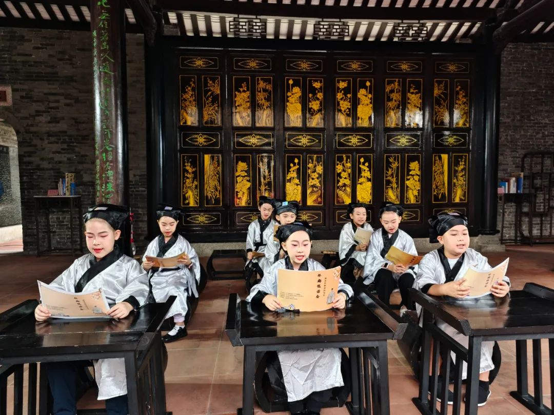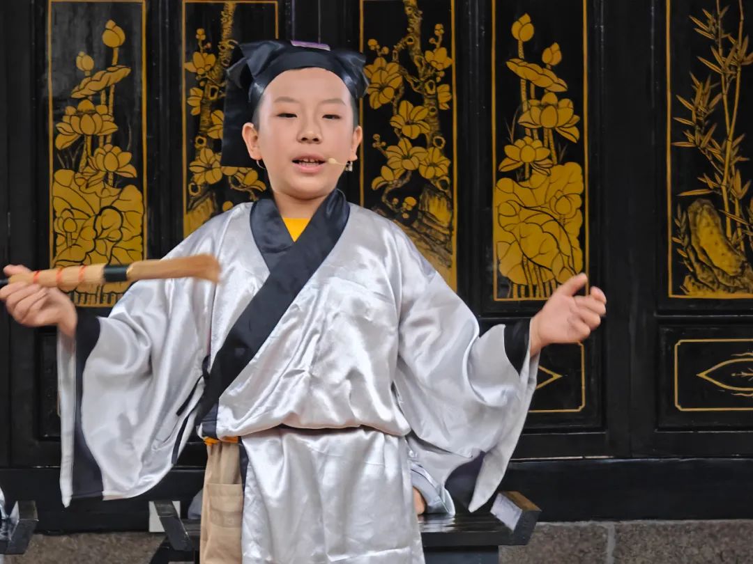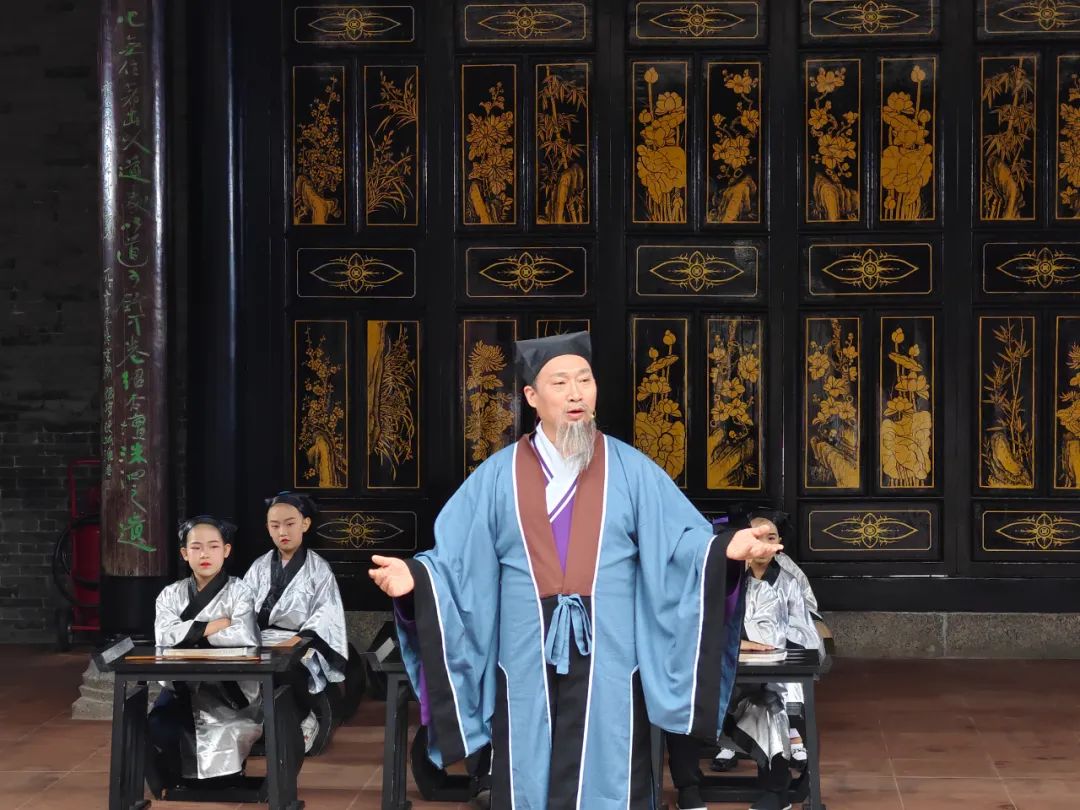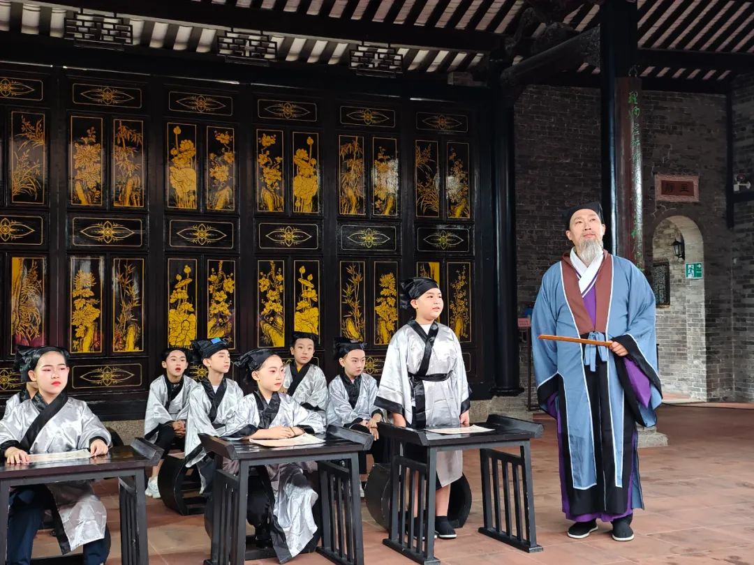 上课钟声一响,身穿古装的11位小书童从嬉戏打闹中跑回到课堂,开始早读《戒懒文》:大舜为善鸡鸣起,周公一饭凡三止……陈白沙先生缓缓来到堂前,给学生上课。