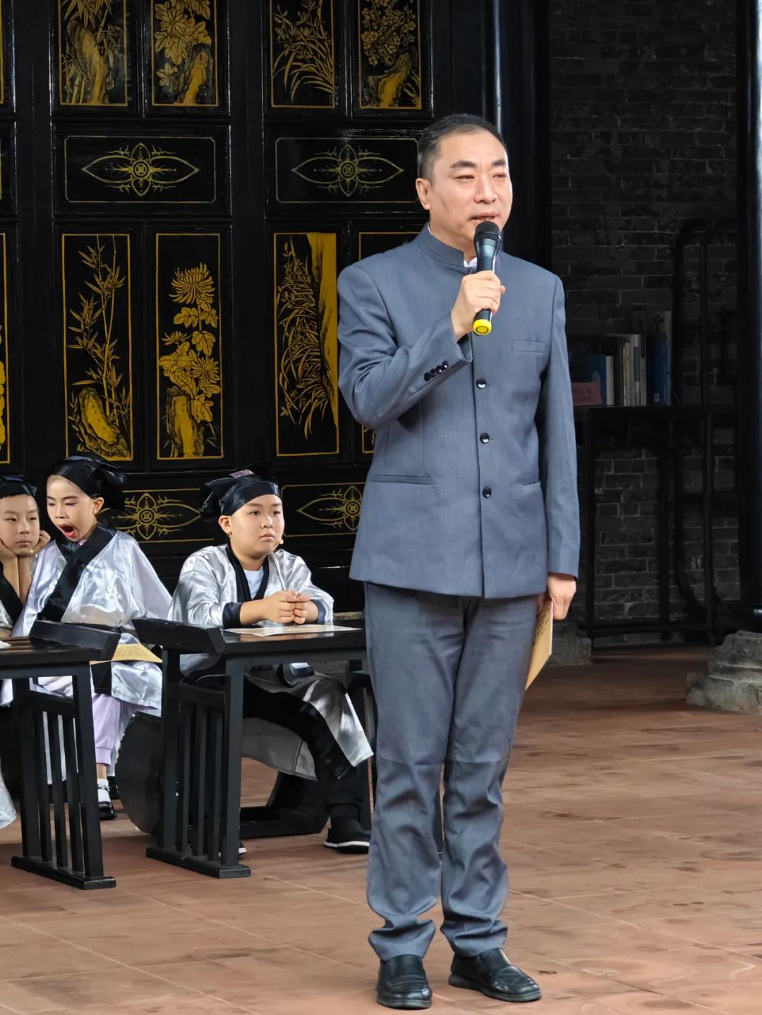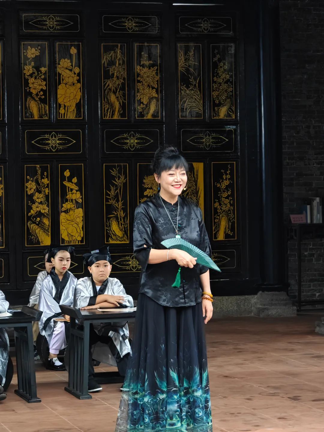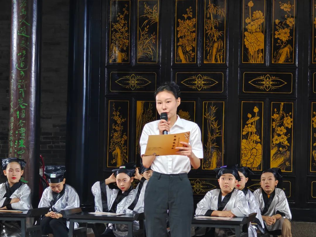 上课钟声一响,身穿古装的11位小书童从嬉戏打闹中跑回到课堂,开始早读《戒懒文》:大舜为善鸡鸣起,周公一饭凡三止……陈白沙先生缓缓来到堂前,给学生上课。