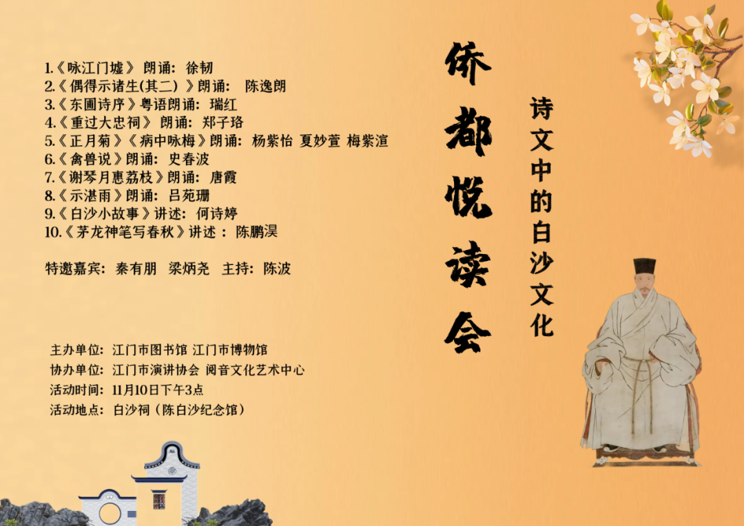 “侨都悦读会之‘诗文中的白沙文化’”活动亮点纷呈,精彩有趣。大家在耳目一新的体验中寻觅岭南大儒陈白沙先生的风采,在绝美的诗文中领略白沙先生的崇尚自然与内心宁静的高洁情操,在动人的故事中感受白沙先生的家风与学风,在专家访谈中领会白沙先生深邃的哲学思想和独特的人生感悟。此次活动是SG飞艇(中国)开奖记录查询站公共文化文旅融合的有力创新,对传承和弘扬优秀传统文化、江门文化名城的建设及湾区特色文化的塑造注入新的活力。