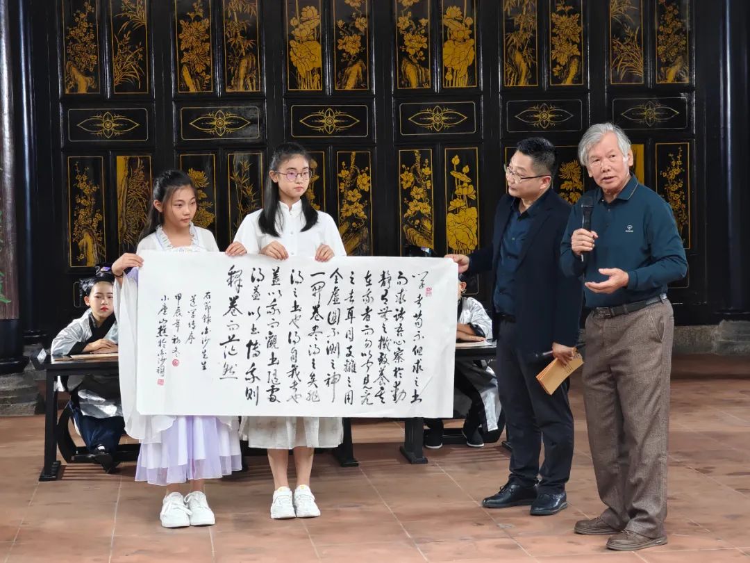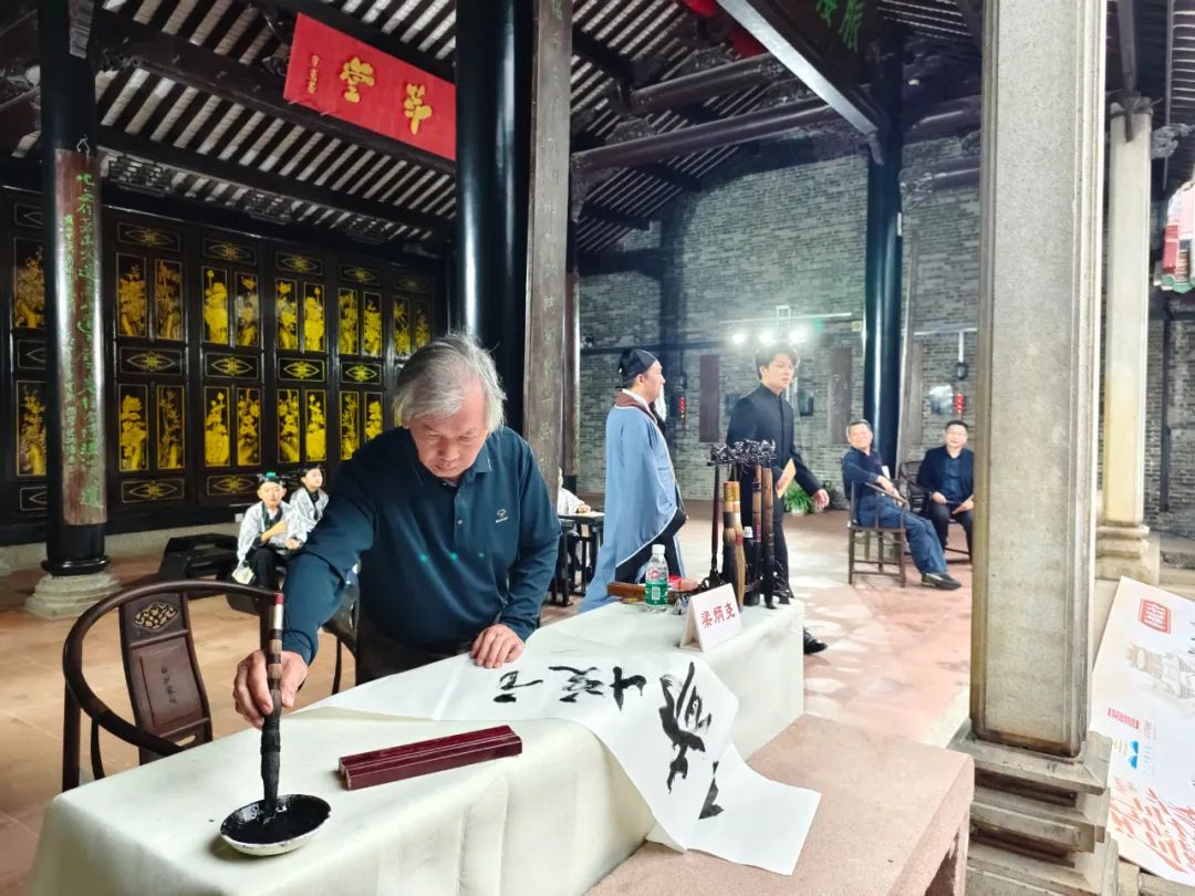 陈鹏淏小朋友朗诵的《茅龙神笔写春秋》,把现场的注意力转移到了白沙茅龙书法上来。陈白沙先生声名远播,茅龙笔书法曾在岭南一带广为流传。在古风古韵的诗文朗诵和白沙思想的解读过程中,梁炳尧馆长的白沙茅龙书法的展示也在同步进行。梁馆长手握茅龙笔,现场挥毫,写下一幅幅刚劲有力、别具一格的茅龙书法,现场用茅龙笔书写了白沙诗文,深深吸引了现场观众,让大家一饱眼福。