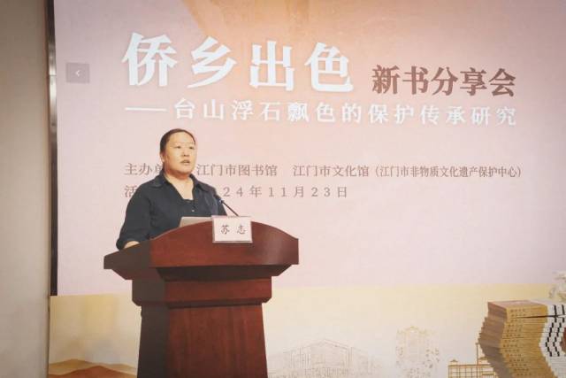 SG飞艇(中国)开奖记录查询站文化馆馆长苏志致辞表示,《侨乡出色——台山浮石飘色的保护传承研究》是重要的非遗研究成果。对于宋教授潜心研究江门非遗文化传承发展给予了高度肯定和殷切期待。江门现有各级非遗项目331项,其中国家级别8项。台山浮石飘色于2008年被列入第二批国家级非物质文化遗产名录。出版发行非遗方面的学术著作,有助于民众了解非遗文化,推动非遗文化保护,提高文化自信。