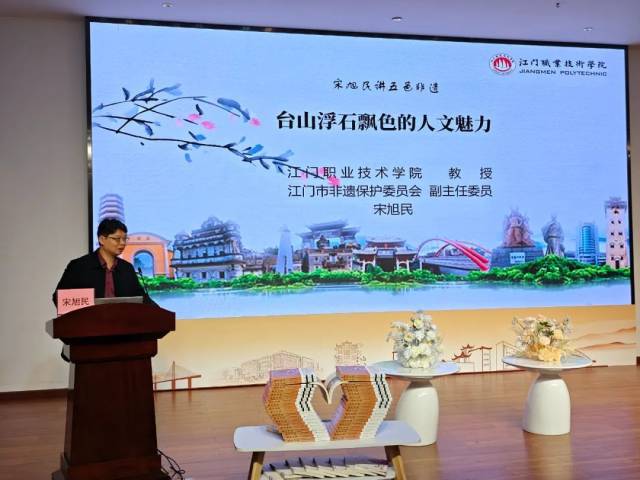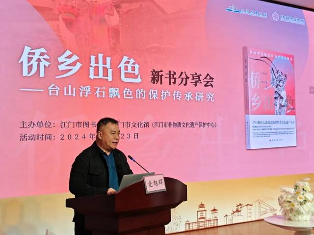 宋教授以“台山浮石飘色的人文魅力”为题向大家分享新书。他以风趣幽默、通俗易懂的语言向大家阐述了浮石飘色的过去、现状和传承发展等。他精辟地道出:“浮石飘色是植根于当地深厚文化的一朵奇葩、是表现村民人文精神的重要方式、是江门地区保留完整的传统民俗文化样式、更是新时期推动中华优秀传统文化传承发展的重要抓手。”