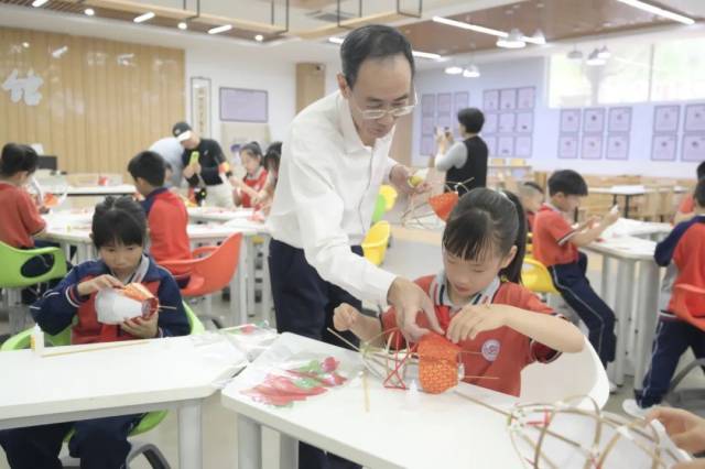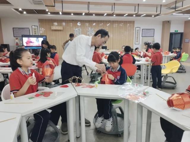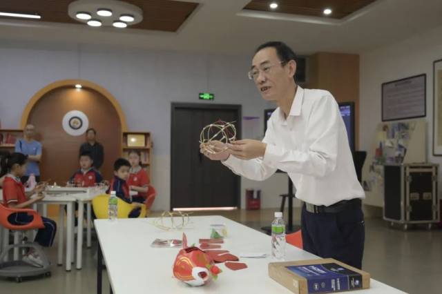非遗体验课和文化课程教学一样,都是从知其名到懂其用再到解其理。新会鱼灯代表性传承人李健华老师首先用视频形式开篇,加深同学们的视觉记忆,从节日场景切入,在分享了鱼灯与自己的成长故事后,一步一步进行示范,手把手指导同学们制作的技巧,很快一条条栩栩如生的“小鲤鱼”便完成了,在半空中成群结队地游动起来,师生们收获满满。