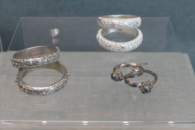当代荔波水族暗八仙纹镂空珠花银手镯、三都水族梅花银耳环、四排银钉戒指