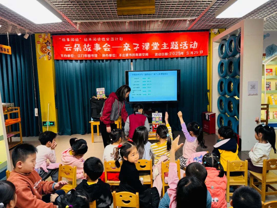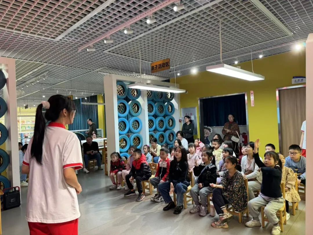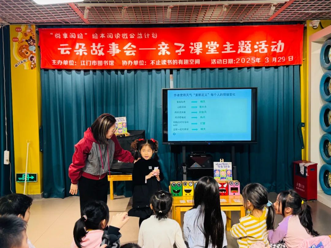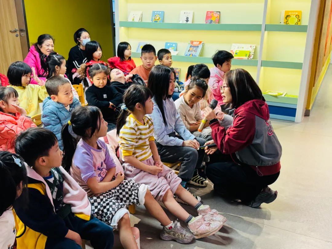 在讲解过程中,文化志愿者老师巧妙地设置了许多互动环节,邀请孩子们举手发言,猜测下一个情节会对应哪种气象。孩子们纷纷积极响应,小手如林般举起,稚嫩的声音充满自信地表达着自己的想法。有的孩子凭借敏锐的观察力,精准地说出答案,赢得了全场的掌声;有的孩子则给出充满创意的回答,虽然与答案稍有偏差,却也展现出了天马行空的想象力,让大家忍俊不禁。家长们也全身心投入其中,他们微笑着鼓励孩子勇敢表达,与孩子们一同沉浸在绘本营造的欢乐氛围里,亲子之间的情感在互动中悄然升温。