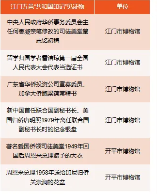 本次展览共展出来自30家单位逾200件(套)藏品,其中,入选“共和国印记”见证物的6件江门五邑地区的见证物首次集中展出,分别是:中央人民政府华侨事务委员会主任何香凝亲笔修改的司徒美堂墓志铭初稿,留学归国学者雷洁琼第一届全国人民代表大会代表当选证书,广东省华侨投资公司宣募委员、加拿大侨胞梁葆常聘书,新中国首任联合国副秘书长、美国归侨唐明照1979年离任联合国副秘书长时的纪念银盘,著名爱国侨领司徒美堂1949年回国后周恩来总理赠予的大衣,周恩来总理1958年送给印尼归侨关崇涧的花盆。