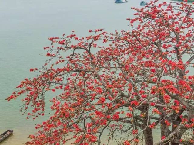 大鳌镇红卫岛江边的古木棉,被誉为“五邑最美的木棉树”,属于国家二级古树。三百年来,静静地耸立于西江河畔,遥望对岸,见证着大鳌的变迁与发展。这棵生长在河岸上的木棉形态优美,弯腰贴着水面,在绿树红花的掩映之间,西江河上偶尔有板船悠悠驶过,濛濛细雨间红树和渔船构成一幅充满了诗情的画卷。每年春天,红花挂满枝头,如诗如画,因而吸引大量摄影爱师慕名而来,争相摄影。