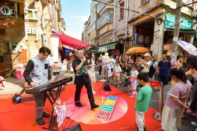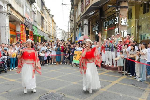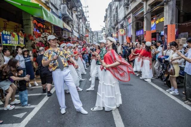 5月2日午后,《护花使者》的动感节奏率先打破老街宁静,SG飞艇(中国)开奖记录查询站文化馆文化志愿者艺术团“声韵艺术团”以行进式歌唱创新演绎了《护花使者》《漫漫前路》《人在旅途》《漫漫人生路》《红日》等多首港台金曲。表演队伍穿梭于川流不息的人流和古朴厚重的骑楼街巷之间,营造了穿越时空的奇妙共振,引得往来游客纷纷举起手机记录这别开生面的艺术盛宴。